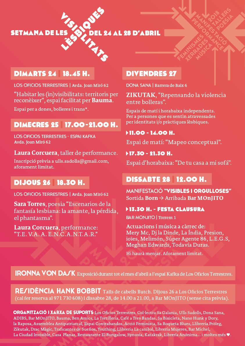 Pel que fa als escenaris on transcorren les activitats de la setmana, la llibreria-perruqueria los Oficios Terrestres serà un d’ells; pels que no la coneixeu, està situada al barri del Terreno de Ciutat, i fou inaugurada el 1928 sota el nom Peluquería Picornell, anys després ja va adoptar aquesta forma de sala d’espera convertida en llibreria especialitzada, l’any 2010 varen baixar la barrera i fou quan l’equip actual de los oficios va agafar-ne el relleu. El local de Dona sana, -l’espai d’informació, assessorament, atenció i formació per dones-. Situat al centre de palma també serà punt d’activitats. I com no podia ser d’altra manera el darrer dia els carrers de palma seran els encarregats d’albergar la manifestació “Visibles i orgulloses”, que començarà Born.