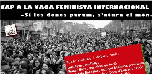 06/03/2018 @ 7:30 pm – 9:00 pm – Què és una vaga feminista? És una vaga contra el sistema? Com hi podem participar totes les dones? Taula redona i debat amb Lola Ayas (Las Kellys), Paula Liñán (Feministes en Acció), Apol·lònia Miralles (MES per Mallorca, professora), Rosi Navarro (Àrea de la Dona d’Esquerra Unida), i companyes d’Acció Feminista i d’Adibs.