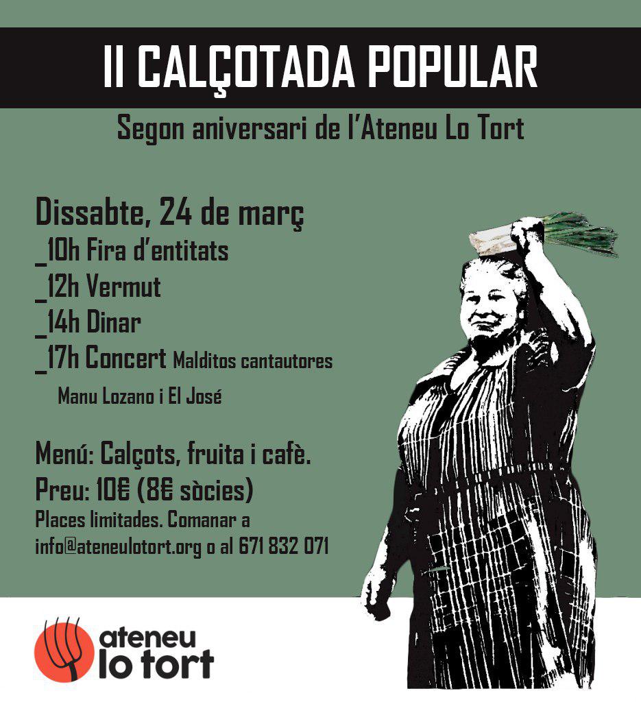 En motiu del segon aniversari l’Ateneu Lo Tort celebra la també segona calçotada popular. Serà dissabte 24 de març a partir de les 10 del matí. Començarem amb una fira d’entitats a la plaça, a les 12h es farà el vermut i ja a les 14h el dinar. A l’horabaixa, a les 17h, hi haurà concert de Malditos Cantautores amb Manu Lozano i El José.