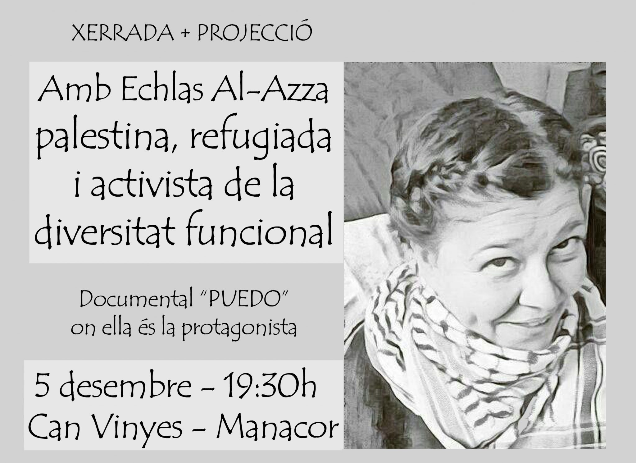 Xerrada + projecció del documental “PUEDO”, contarem amb la participació de la protagonista Echlas Al-Azza, palestina refugiada i activista de la diversitat funcional.